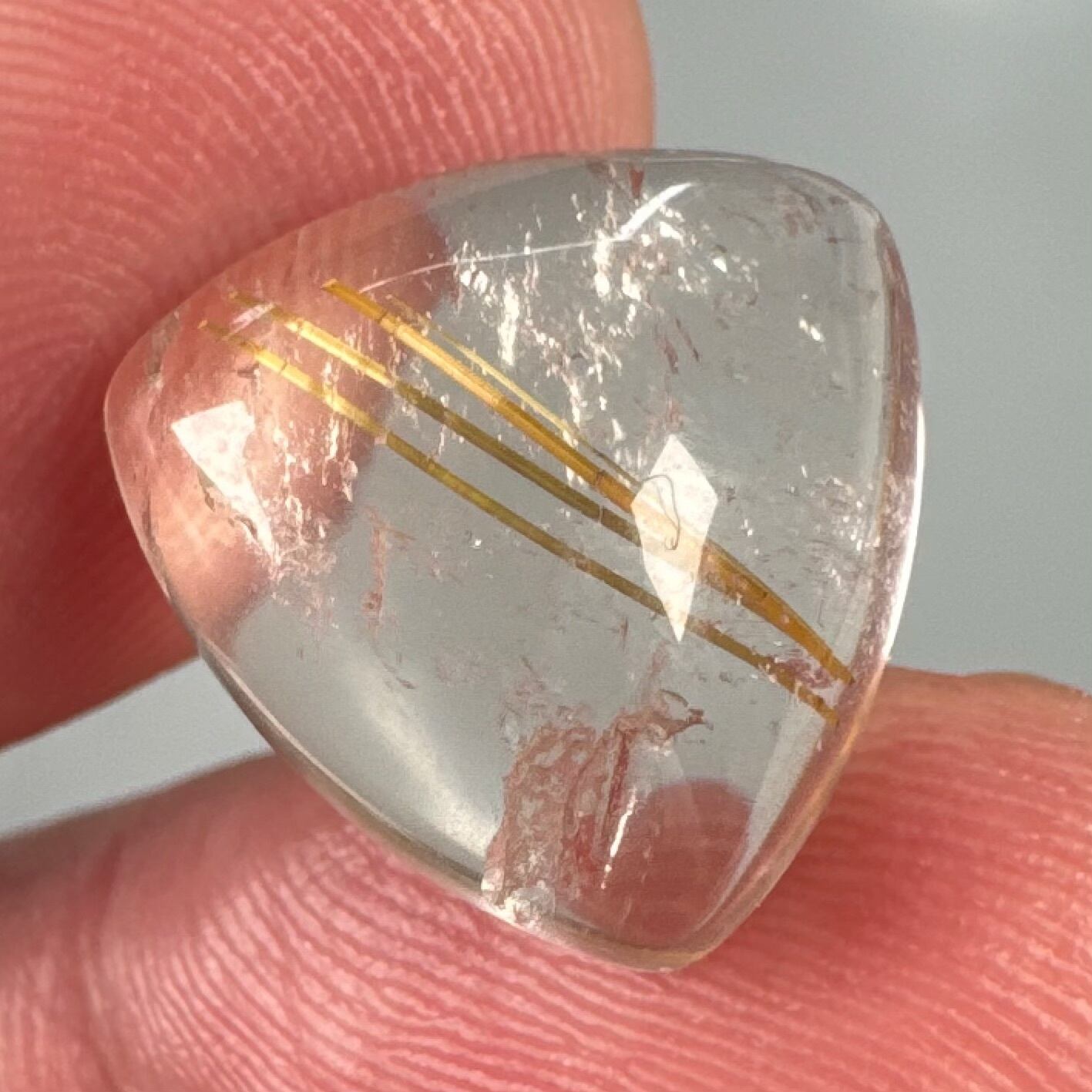 透明度の高い水晶の中に、控えめながらも美しく輝くルチルの針が見られるルースです。