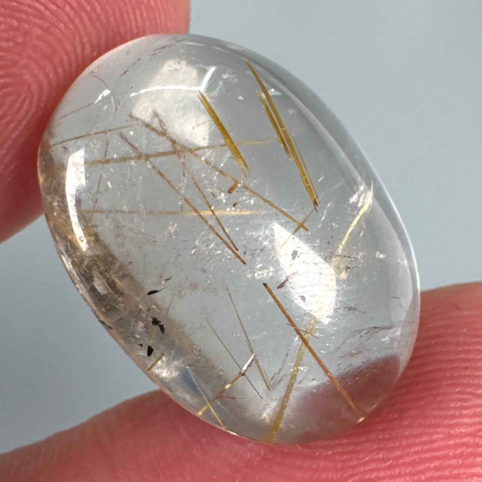 透明度の高い水晶の中に、控えめながらも美しく輝くルチルの針が見られるルースです。