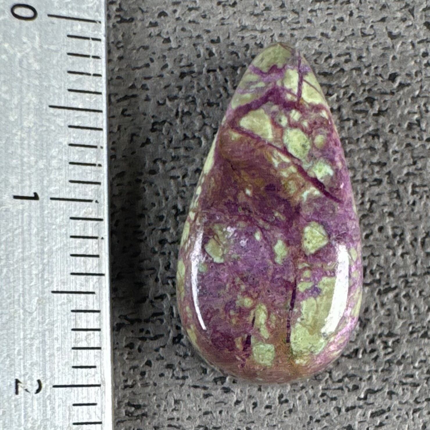 鮮やかな赤、もしくは紫と、サーペンティンの緑が混ざり合う希少な鉱物です。