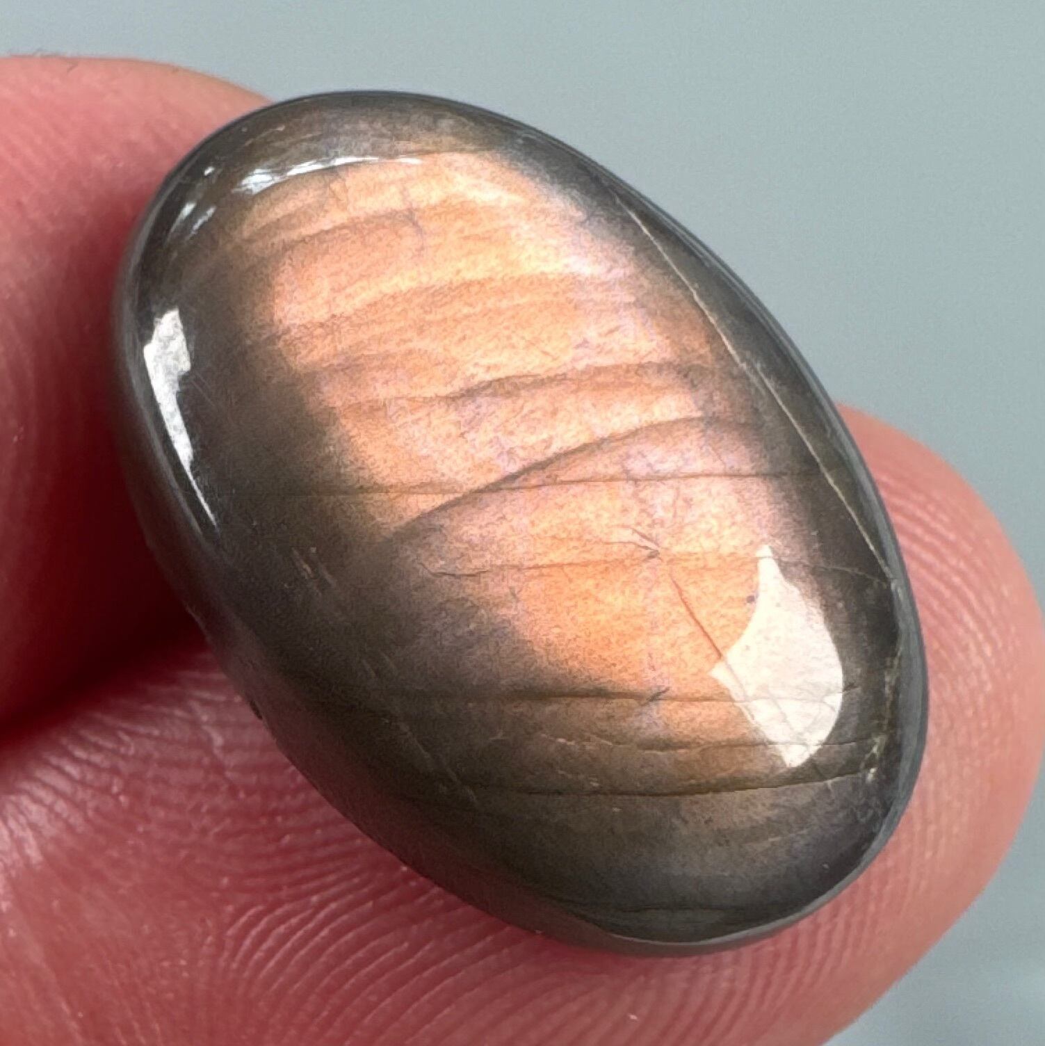 ラブラドライトの中でも特に珍しい、ピンクシラーがふんわりと浮かび上がる特別なルース。