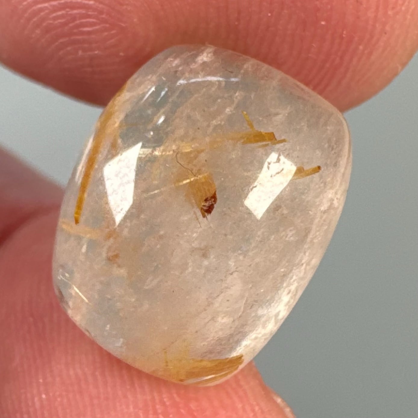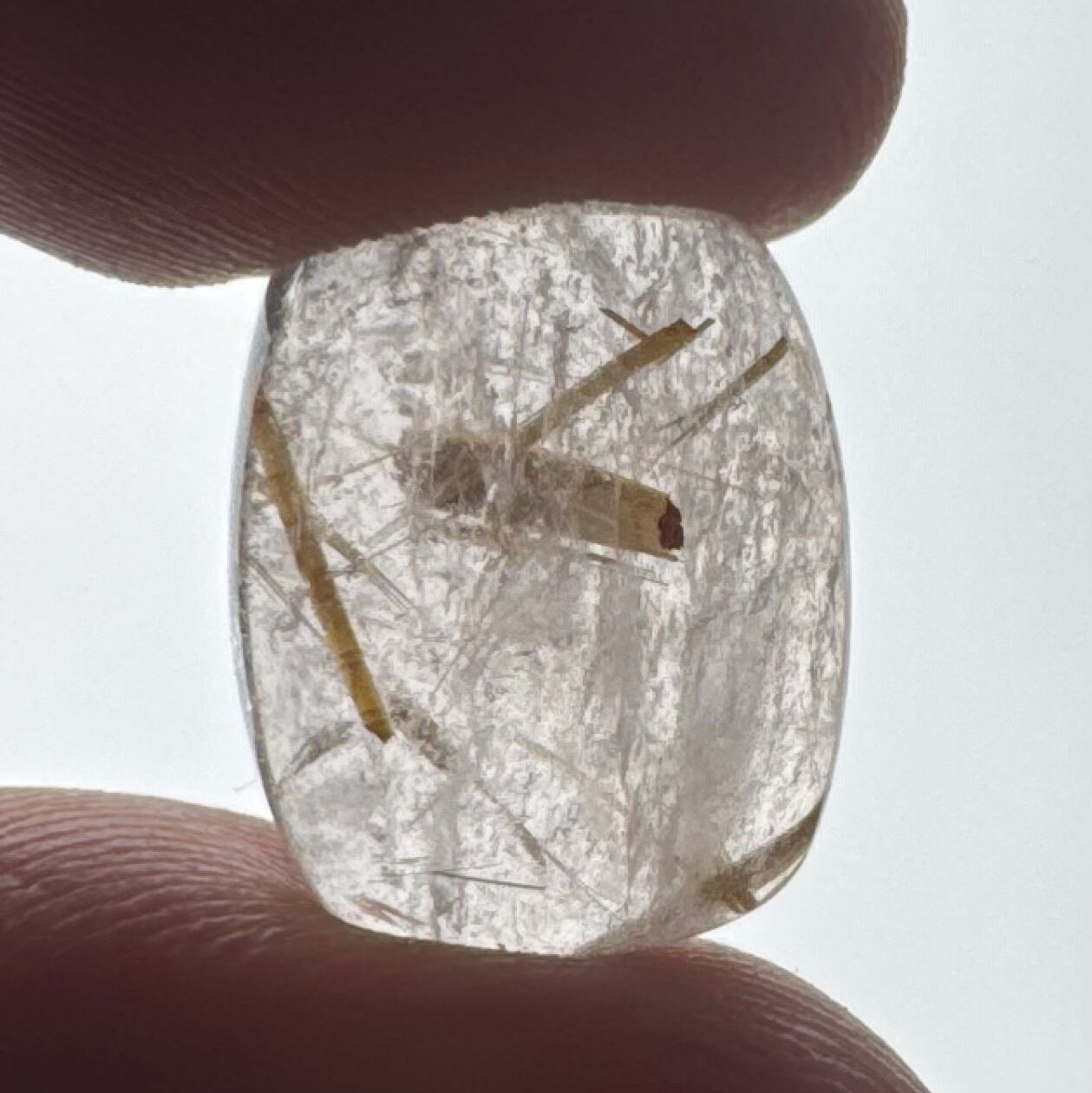 透明度の高い水晶の中に、控えめながらも美しく輝くルチルの針が見られるルースです。
