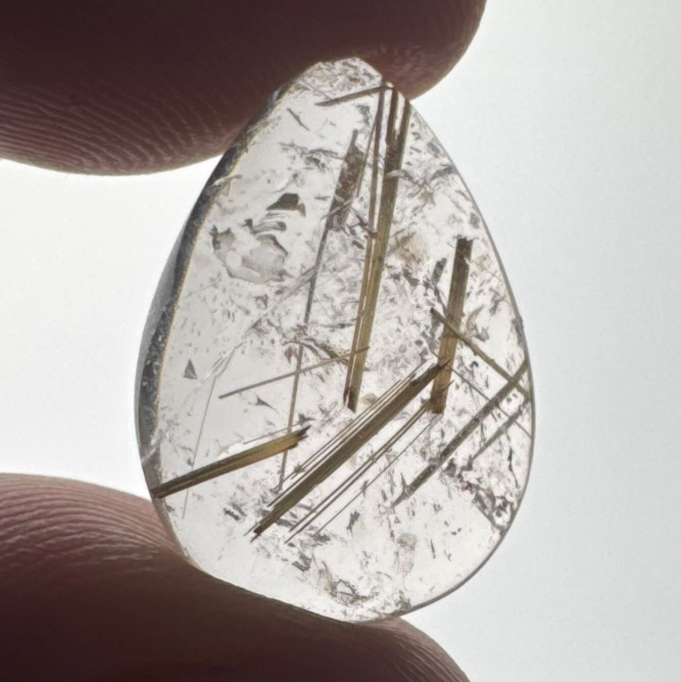 透明度の高い水晶の中に、控えめながらも美しく輝くルチルの針が見られるルースです。
