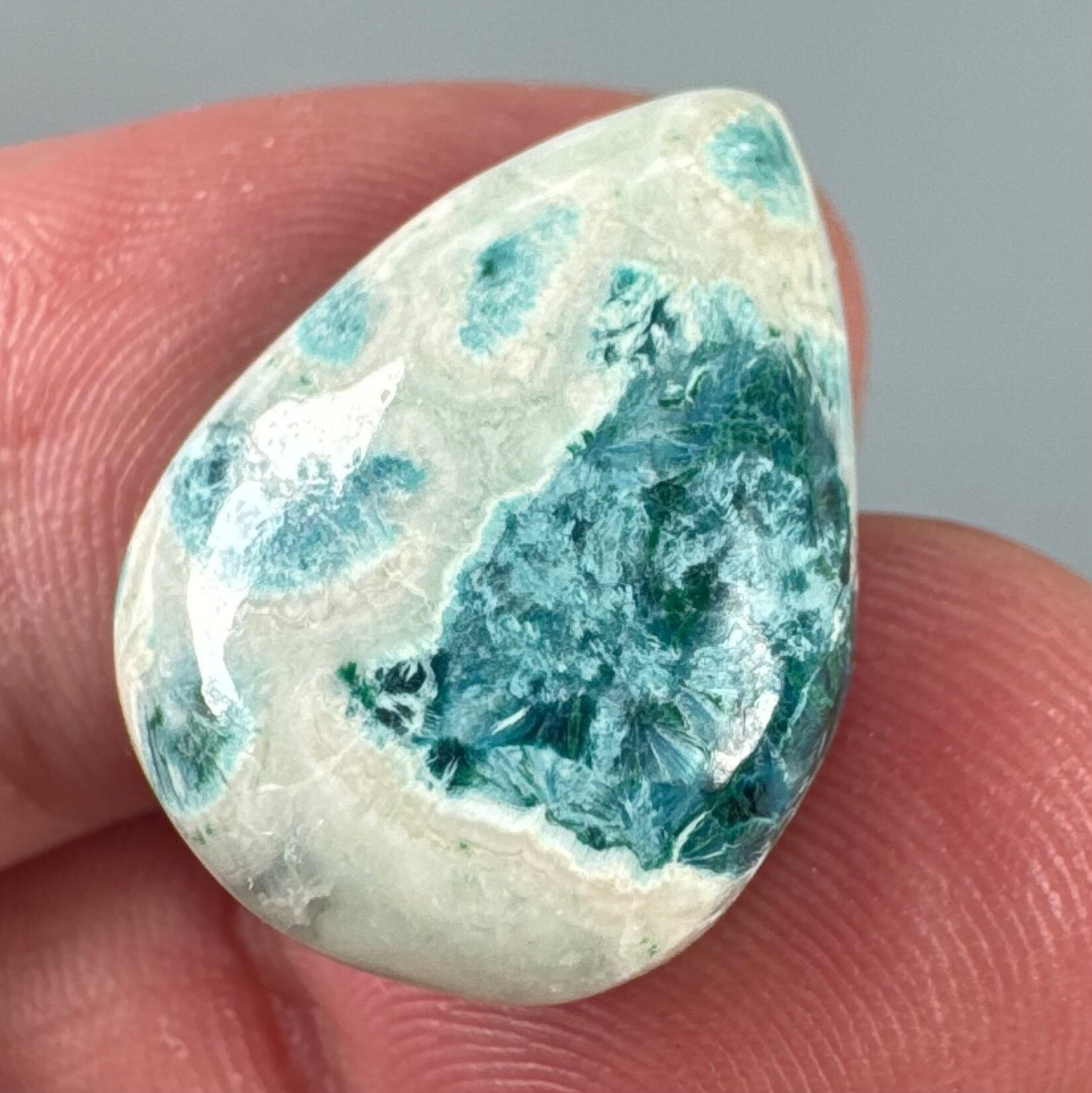 白く優しい石英の中に、淡いブルーやグリーンの模様が浮かぶホワイトクリソコラ。