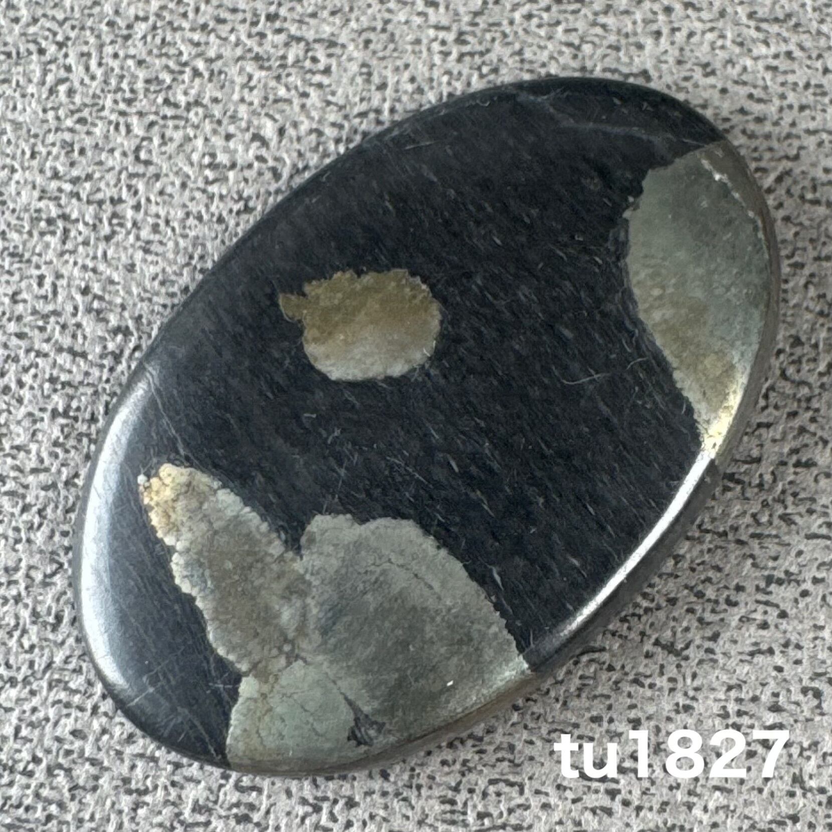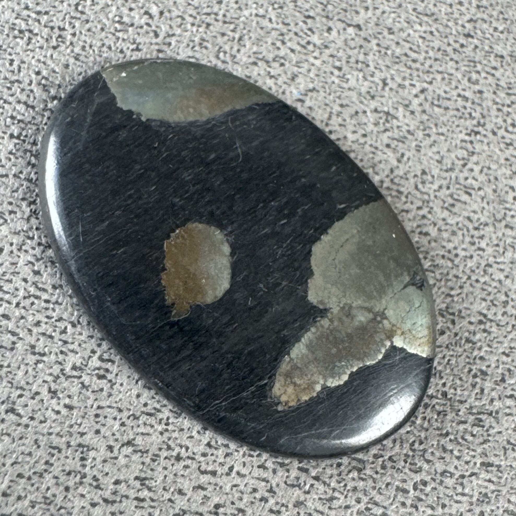 こちらは、炭素鉱物「シュンガイト」と、金属光沢を放つパイライトが共生した、