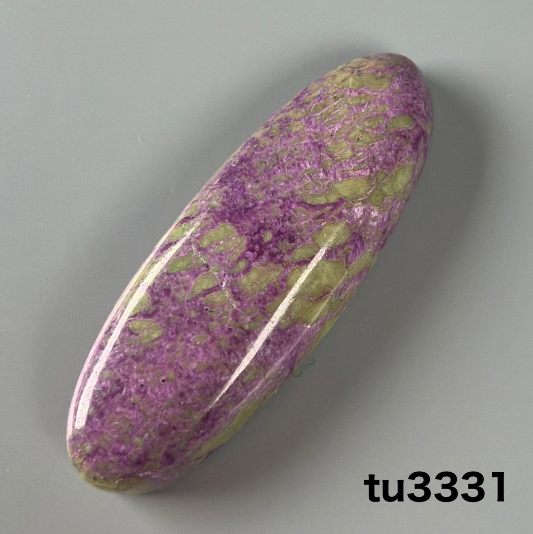 鮮やかな赤、もしくは紫と、サーペンティンの緑が混ざり合う希少な鉱物です。