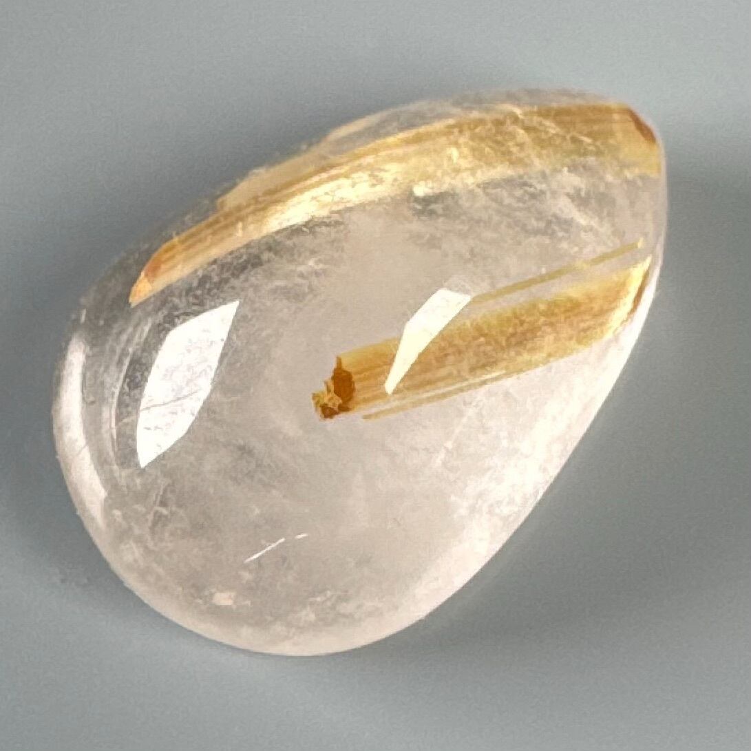 透明度の高い水晶の中に、控えめながらも美しく輝くルチルの針が見られるルースです。