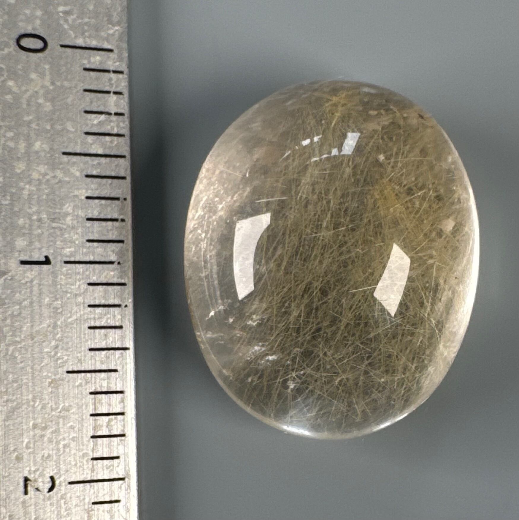 透明度の高い水晶の中に、控えめながらも美しく輝くルチルの針が見られるルースです。