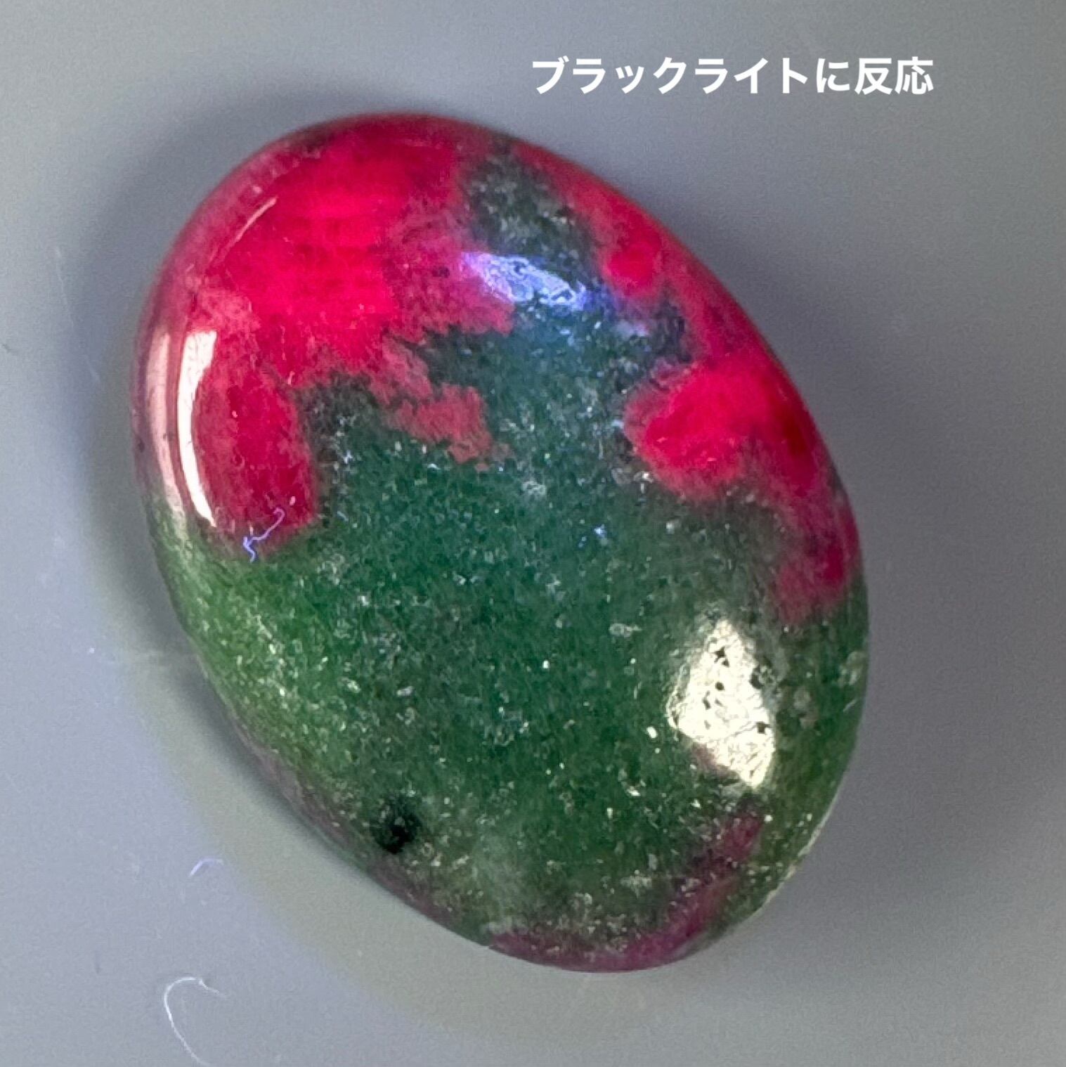 ブラックライトに反応するコランダム特有の性質が見られます。