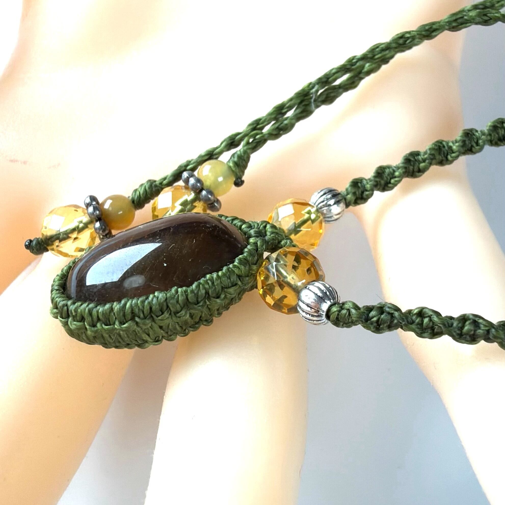落ち着いたオリーブ色のマクラメで丁寧に包みました。