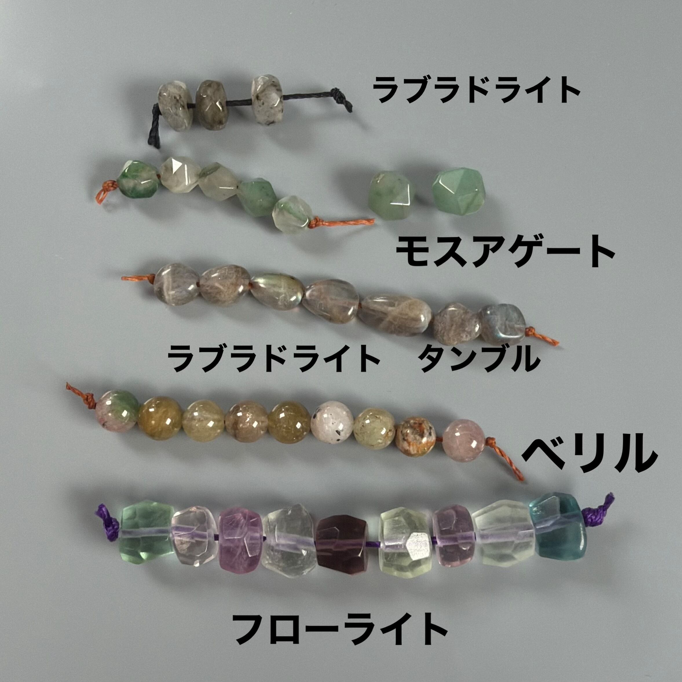 内容:モスアゲート、ラブラドライト、ベリル、フローライト。
