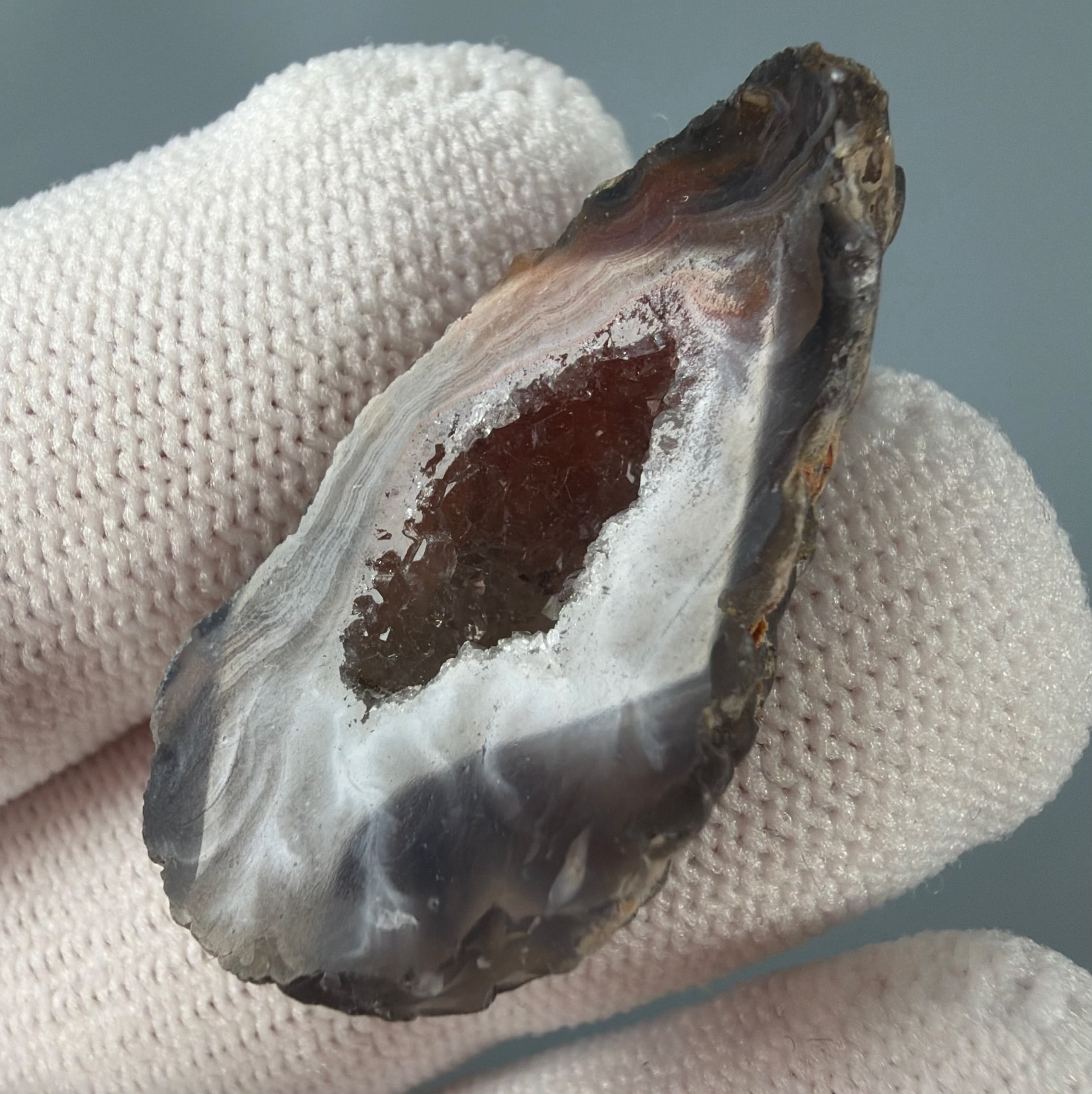 外側はやわらかな縞模様、内側は光を受けて瞬く結晶の群れ