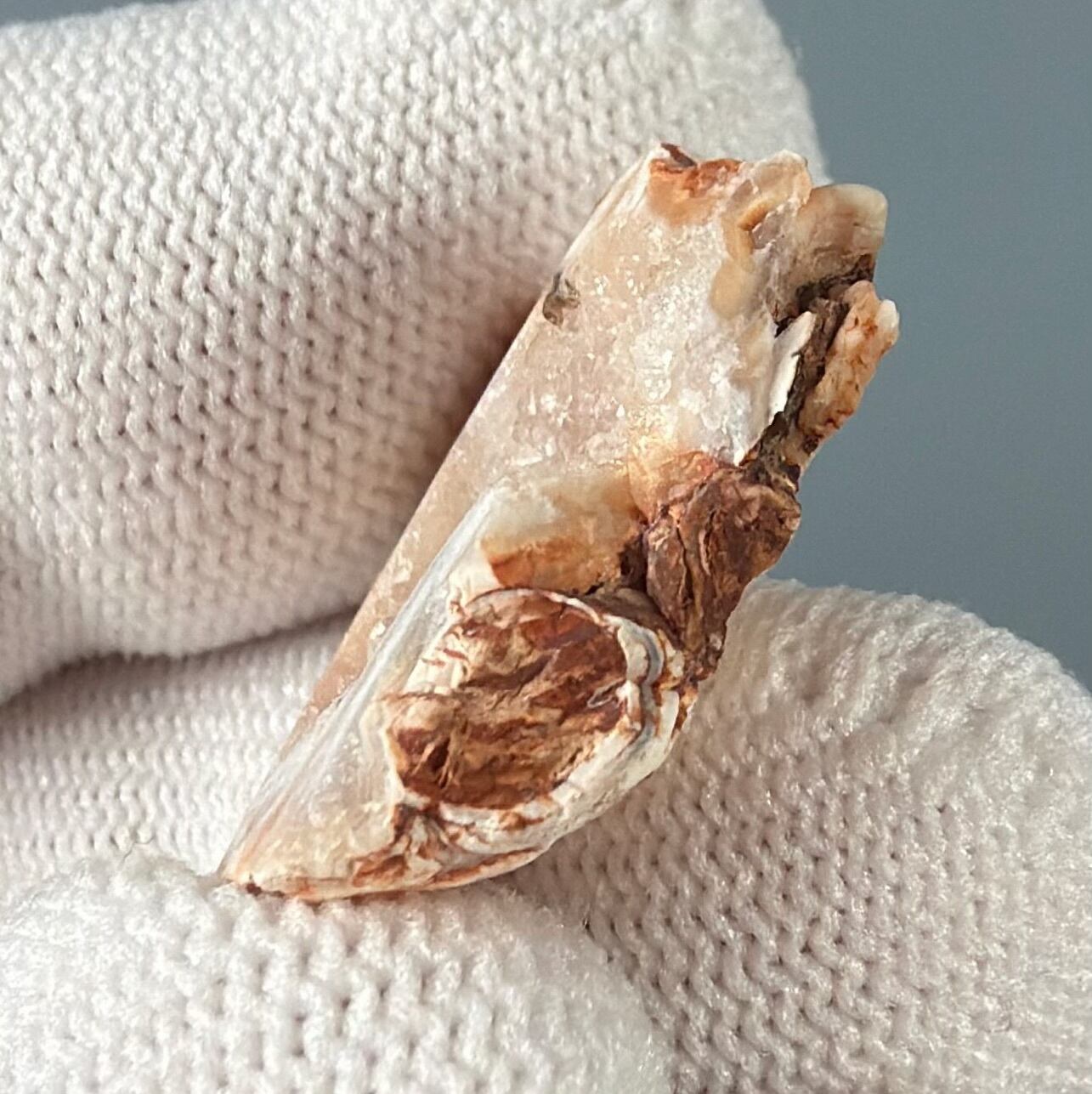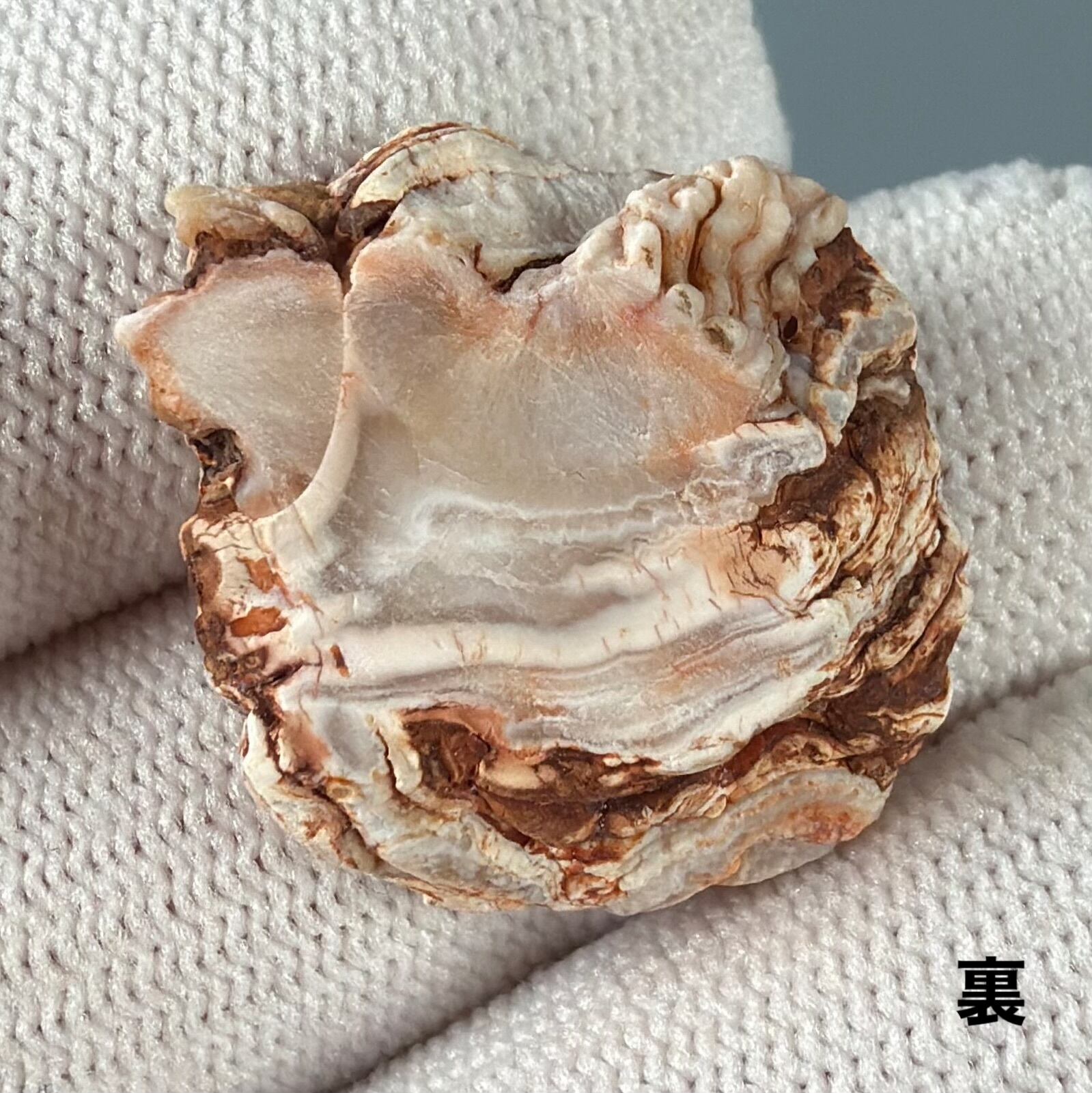 外側はやわらかな縞模様、内側は光を受けて瞬く結晶の群れ