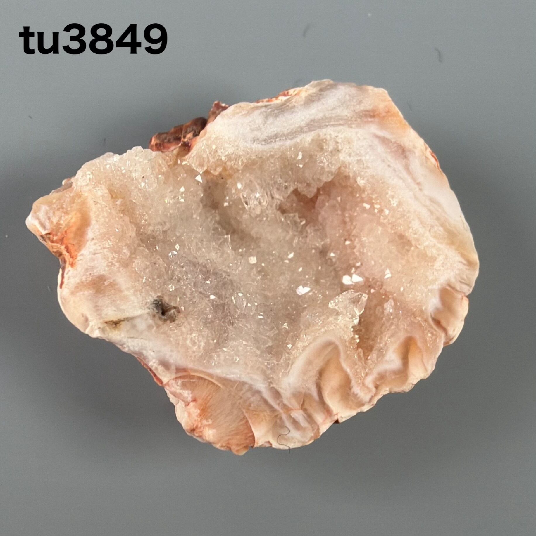 瑪瑙の層がゆるやかに重なり、その中心に石英の結晶がきらめくジオードスライス。