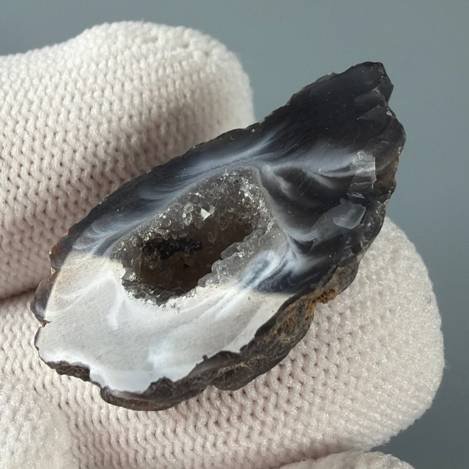 外側はやわらかな縞模様、内側は光を受けて瞬く結晶の群れ
