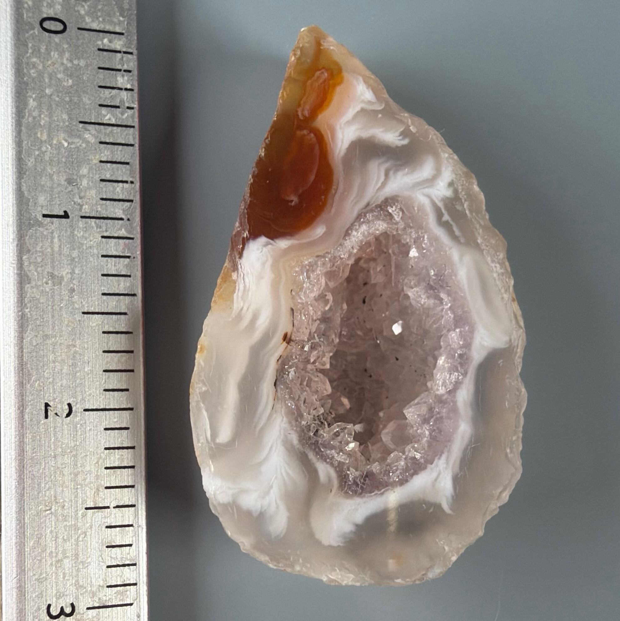 瑪瑙の層がゆるやかに重なり、その中心に石英の結晶がきらめくジオードスライス。