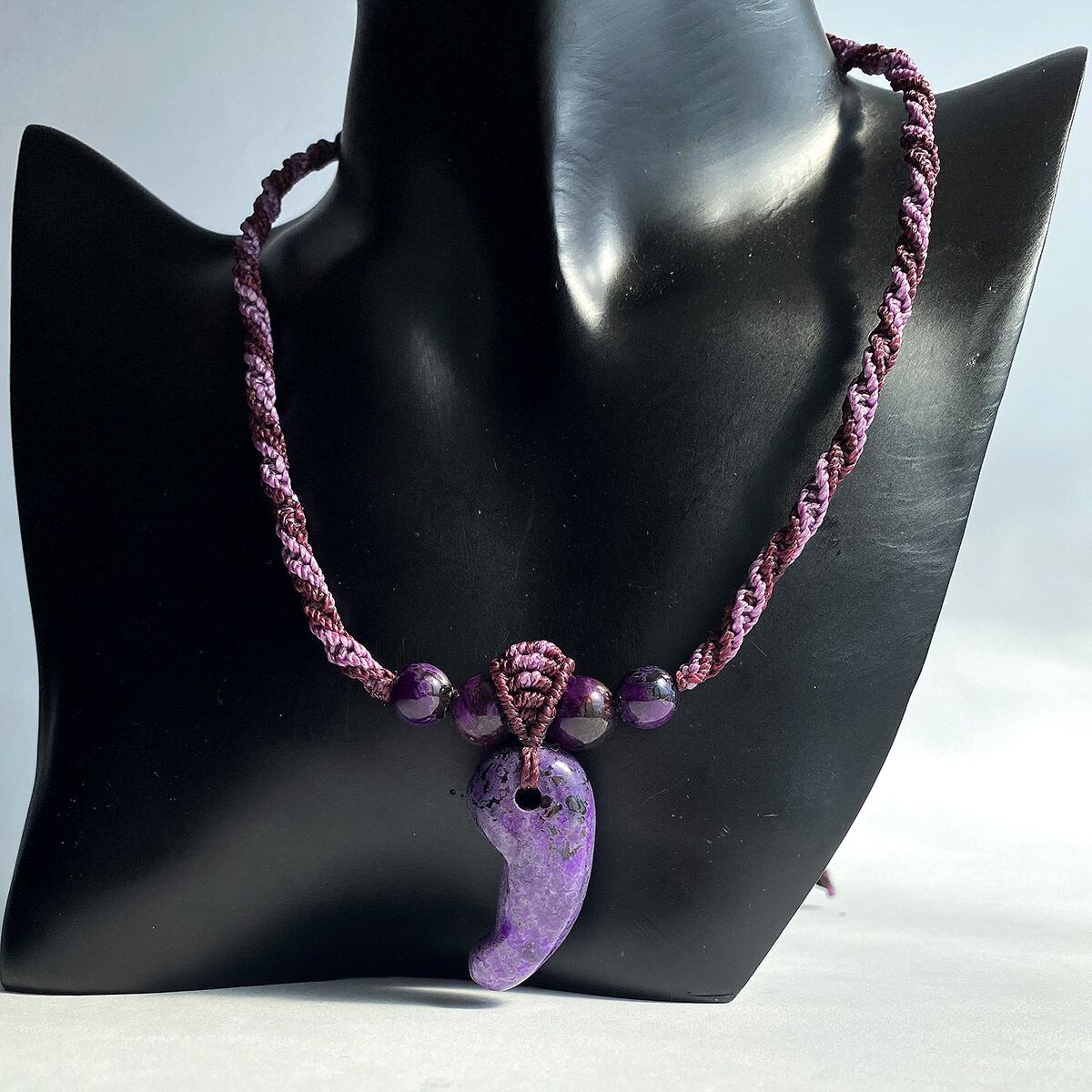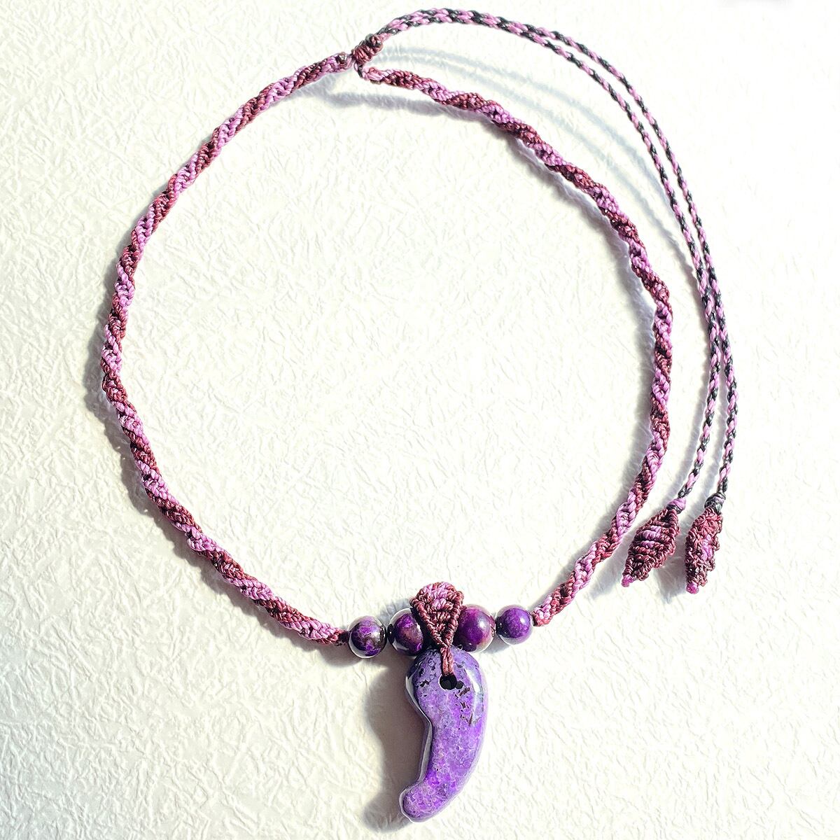 珍しい質の良いスギライトのまが玉をメインにマクラメ編みネックレスを仕上げました。