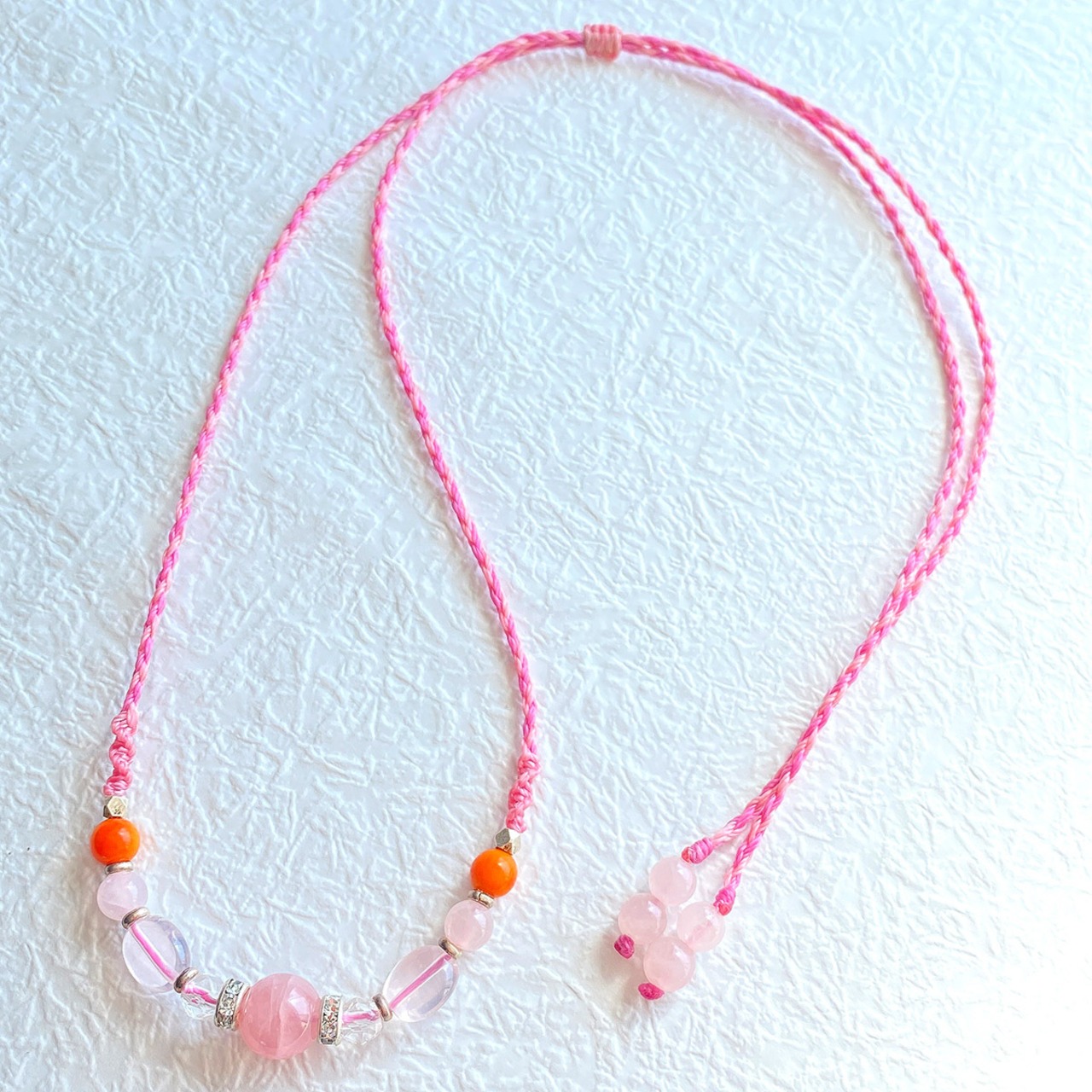 水晶、タンブルローズクォーツ、珊瑚を使って仕上げました。
