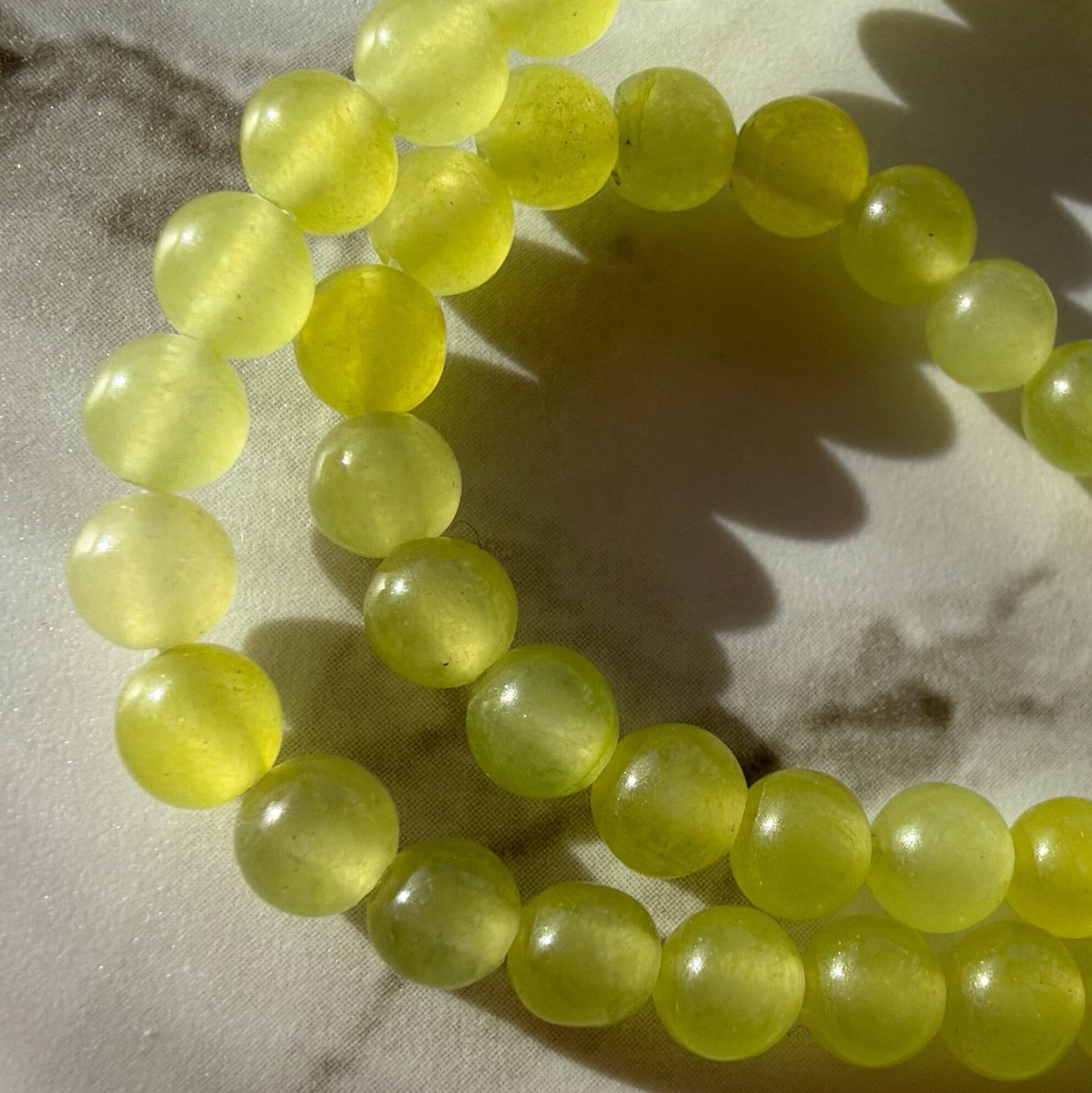 爽やかなイエローグリーンが印象的な、染めカルセドニーのカットビーズです。