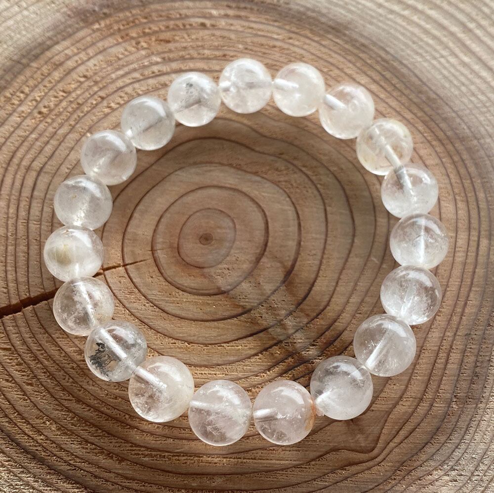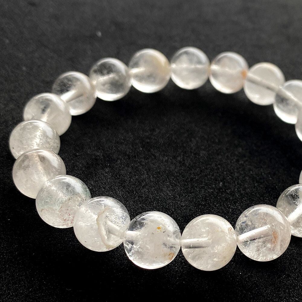 透明度が低いABクラスのポイント水晶の成長痕が内包されている水晶の10.5ミリビーズです。