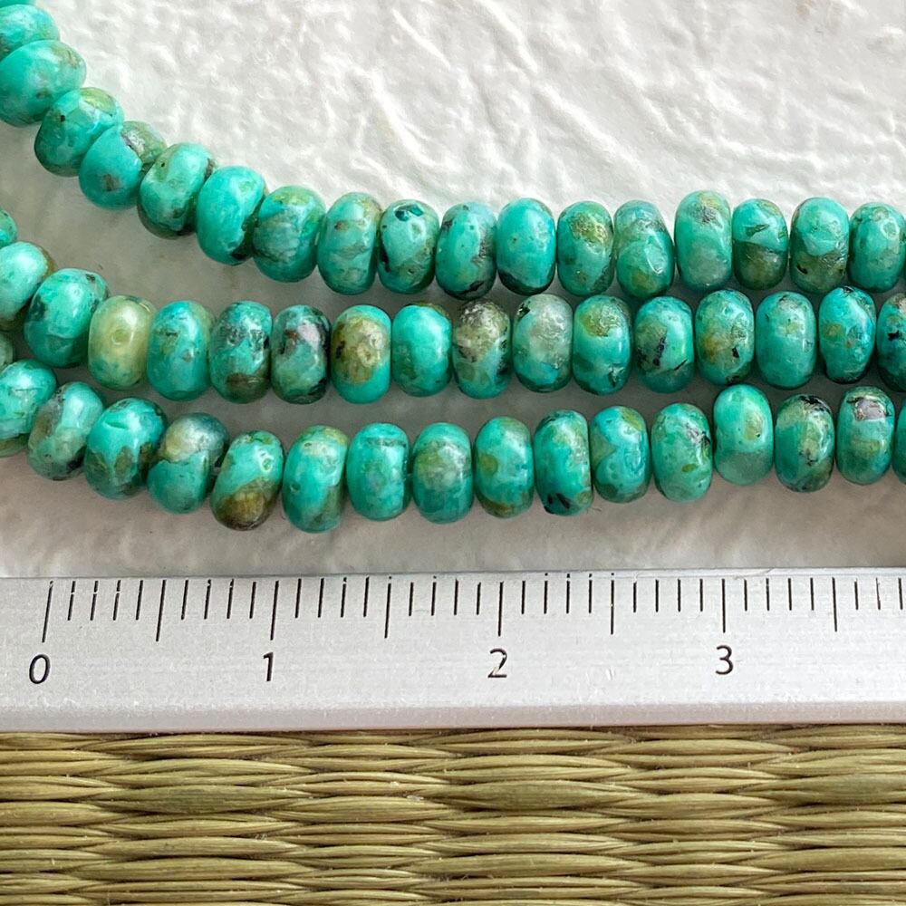 ターコイズのロンデル型 (ボタン型)ビーズ連です。