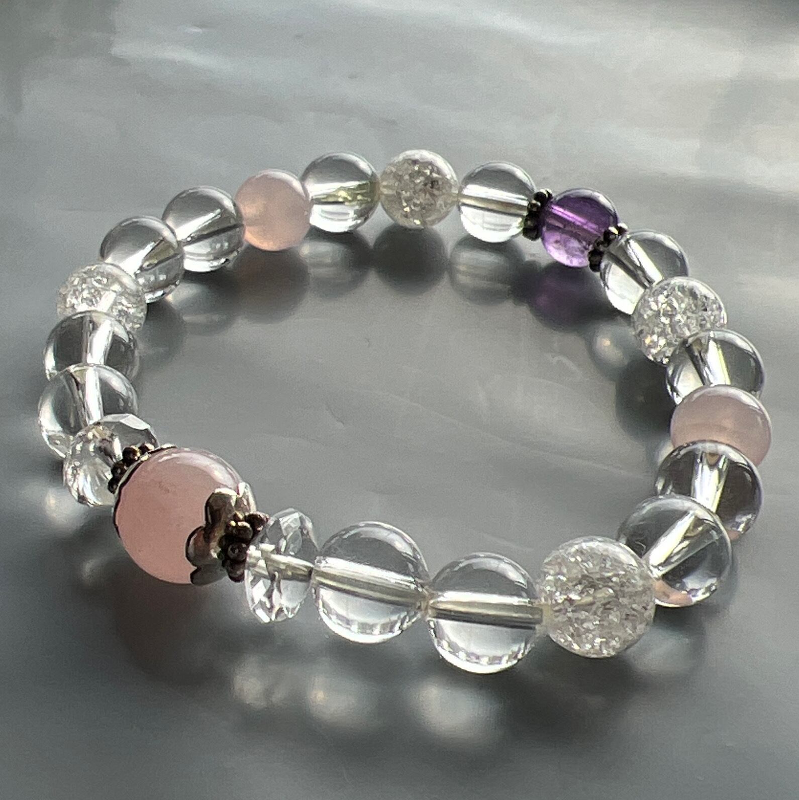 10ミリのローズクォーツと8ミリのアメジストをダブルメインにしたブレスレット。