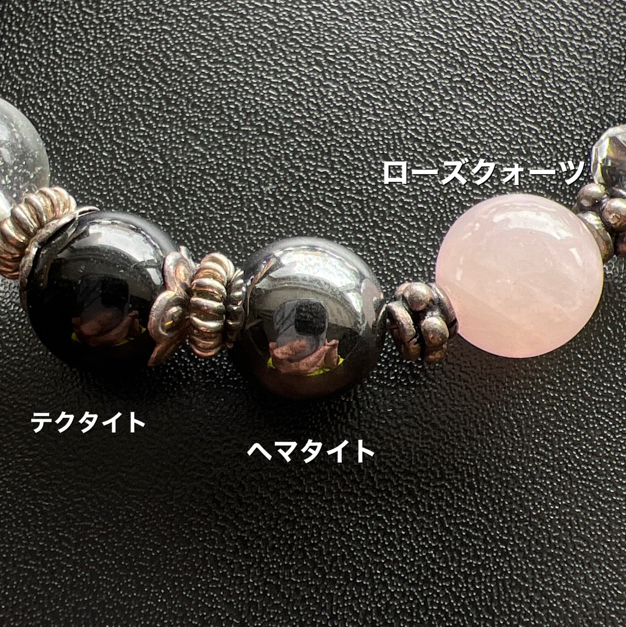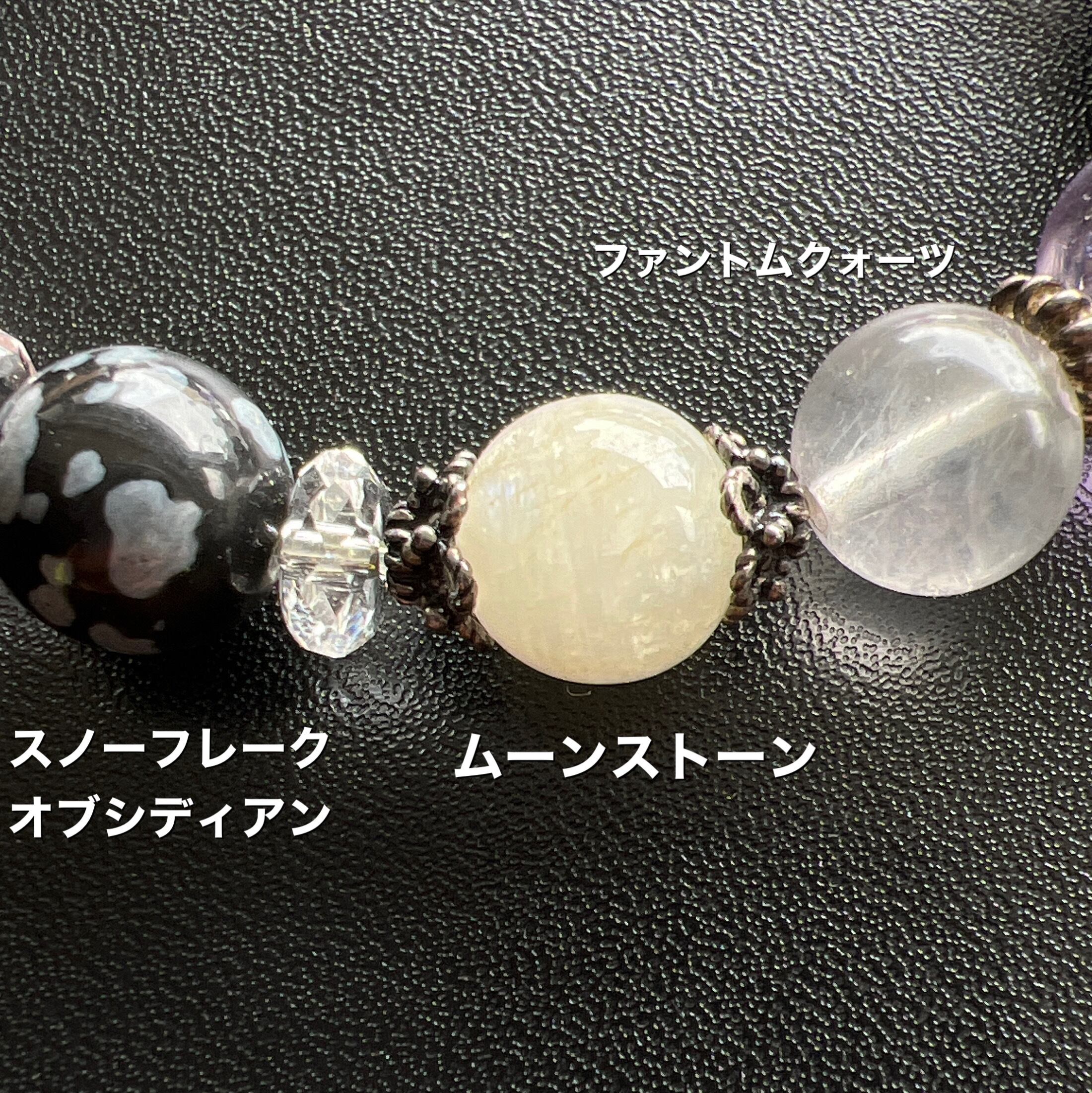 ローズクォーツ、スノーフレークオブシディアン、ムーンストーン、