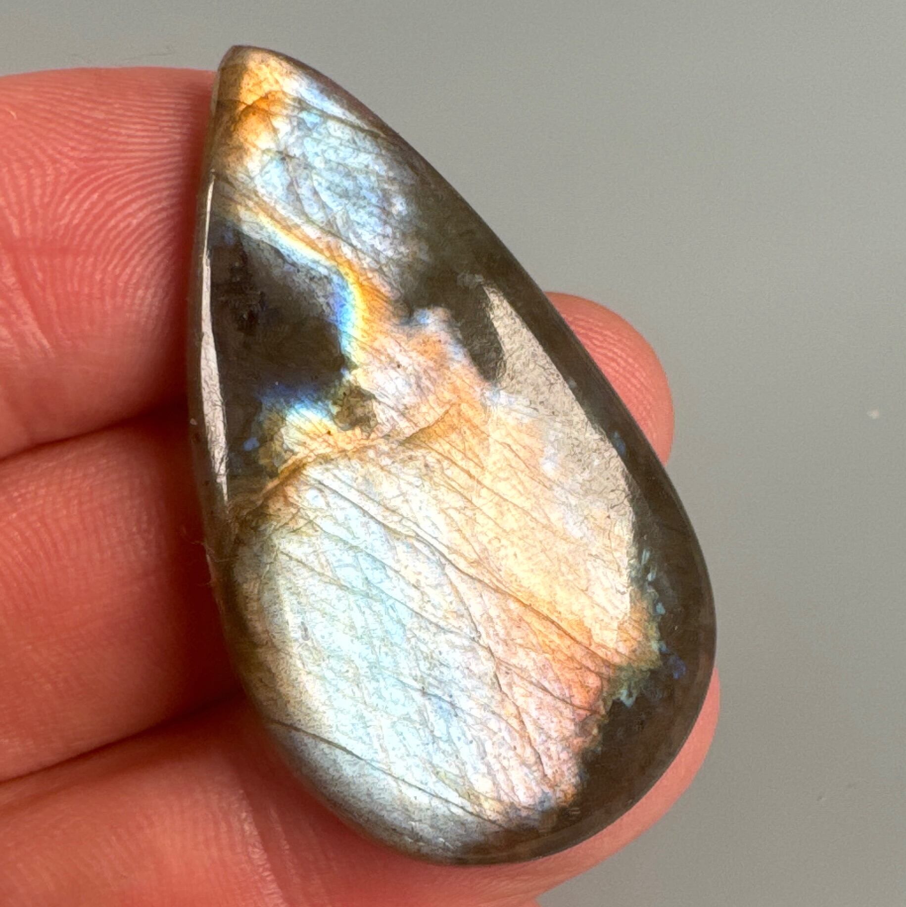 金属的なシラーが見られるラブラドライトのティアドロップ型ルース。