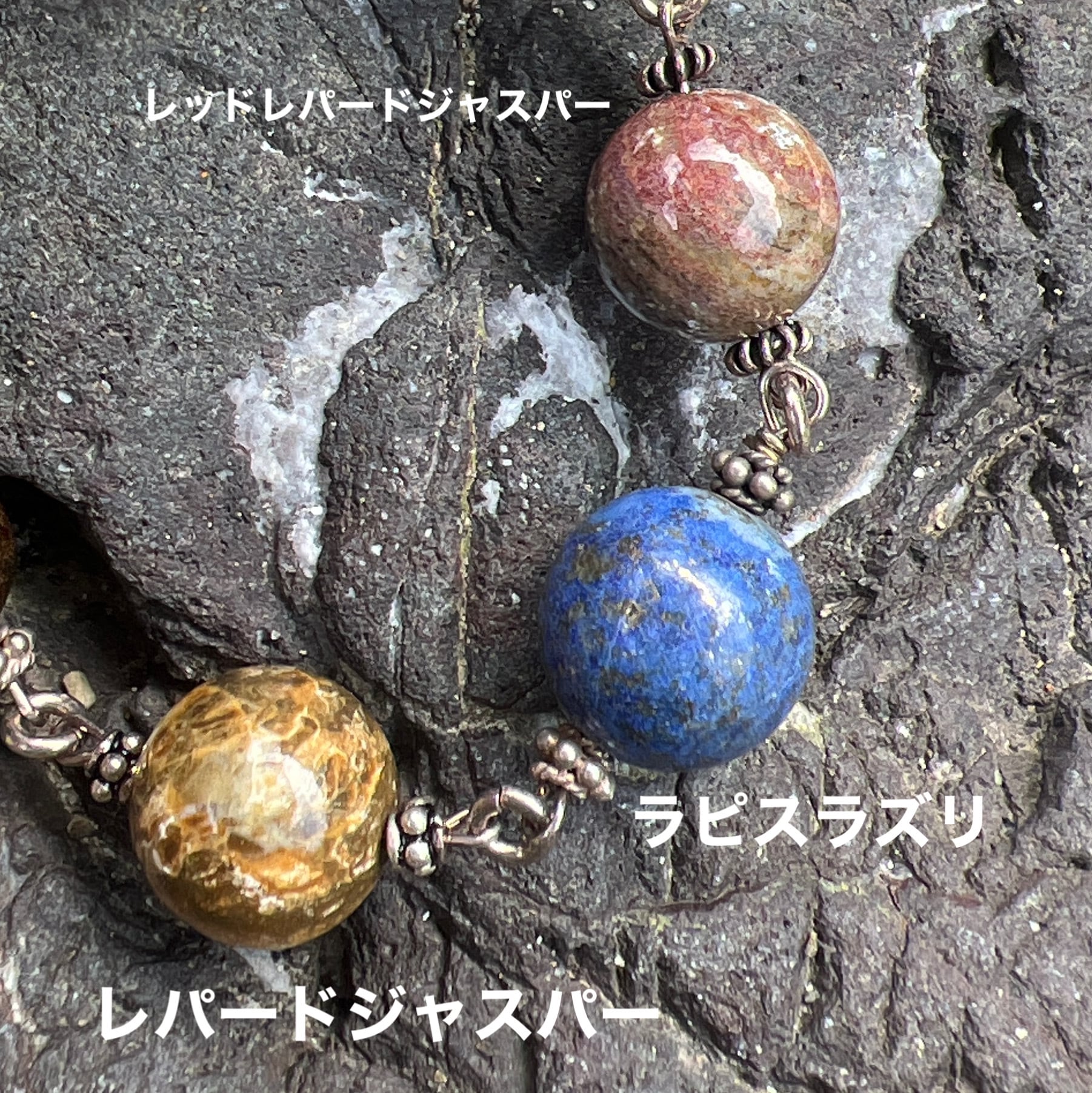 メインに12ミリのラピスラズリ、両サイドにレッドとノーマルのレパードジャスパー12ミリ、