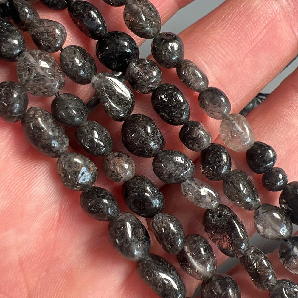 中にはモリオンのような黒い水晶、ほとんど透過しない原石そのもののタンブルビーズです。