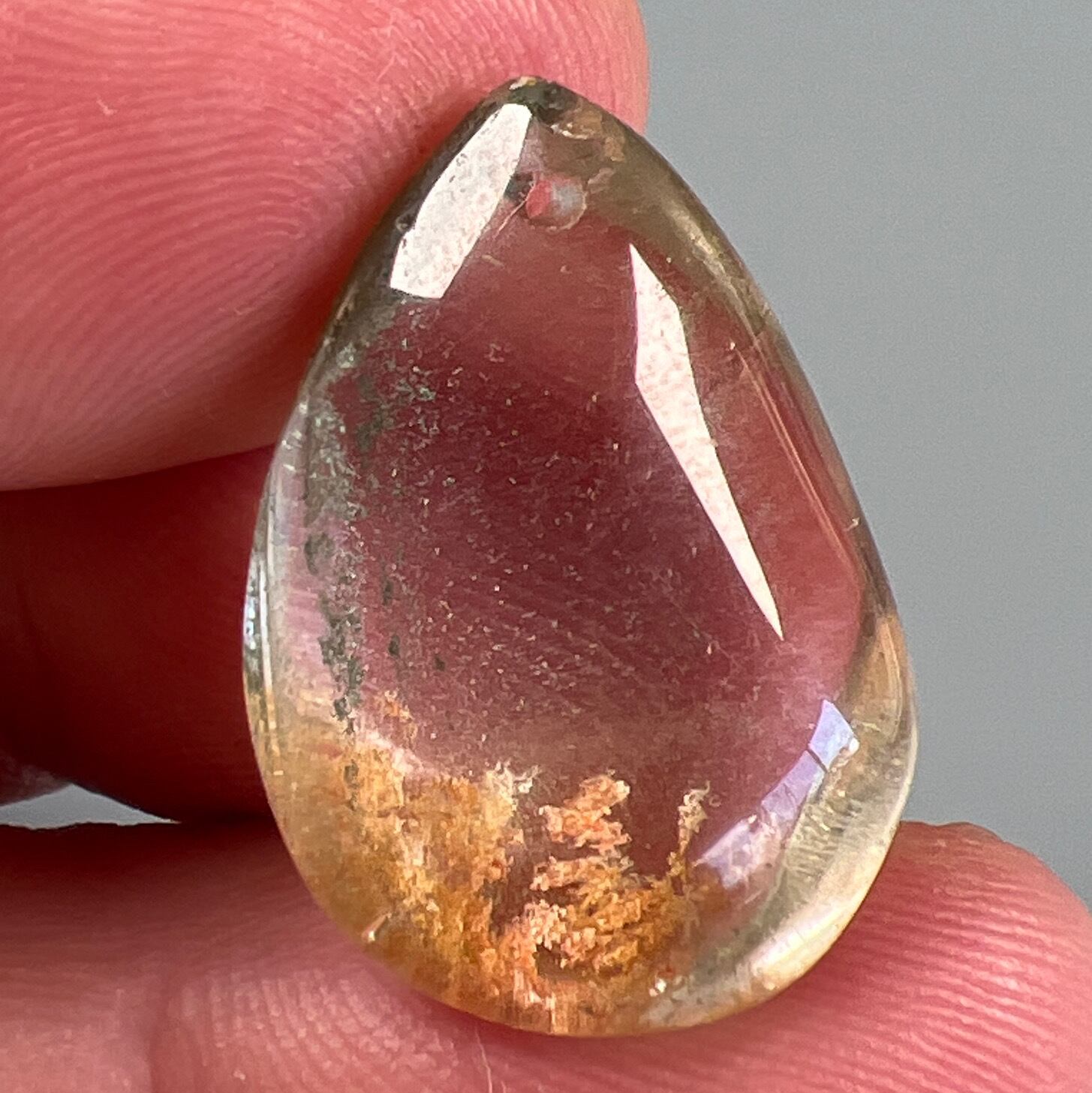 透明感抜群の水晶部にまばらに緑と茶色の内包物が見られます。