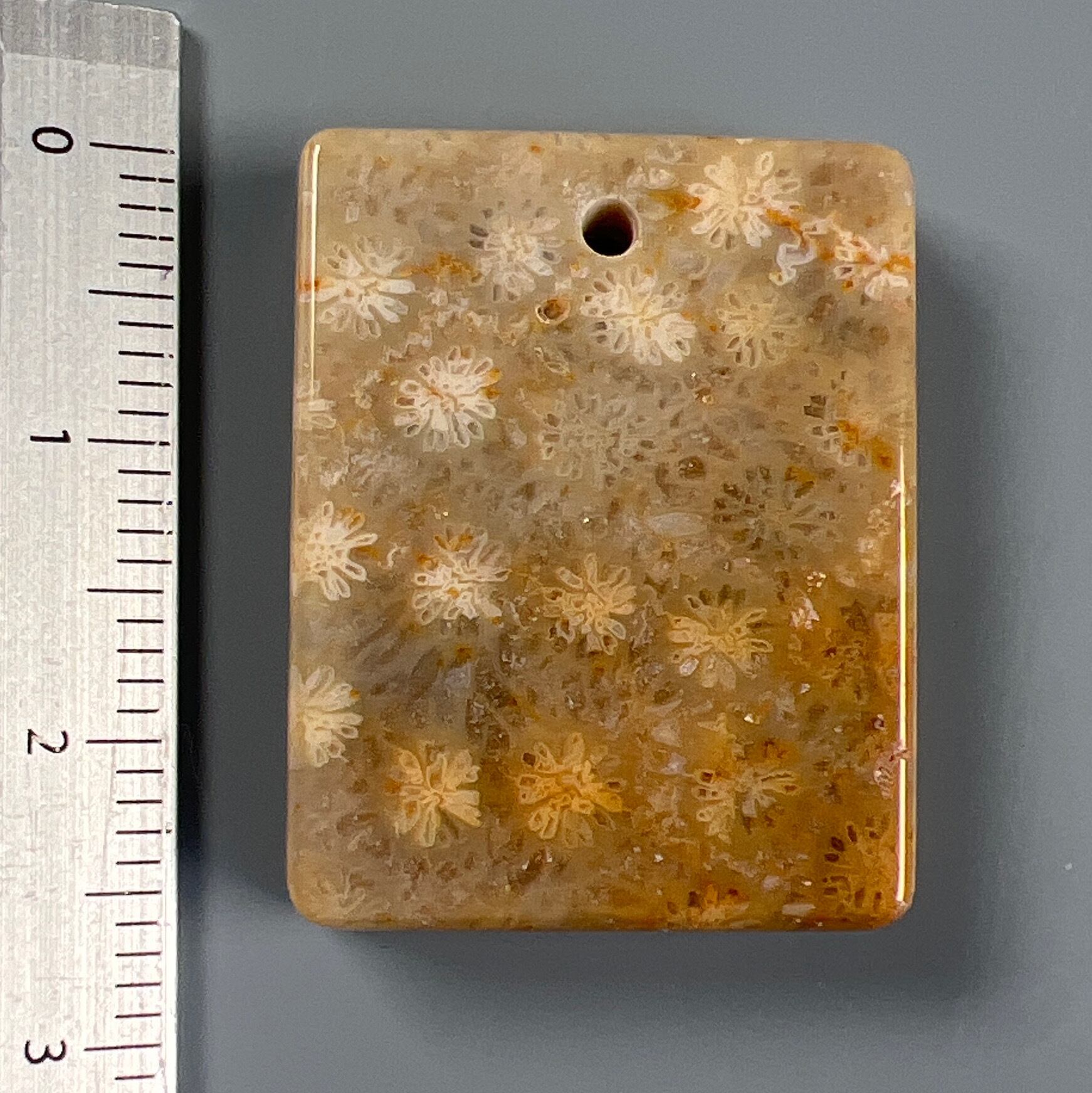 フォッシルコーラルの穴あきレクタグル型ルースをご紹介します。