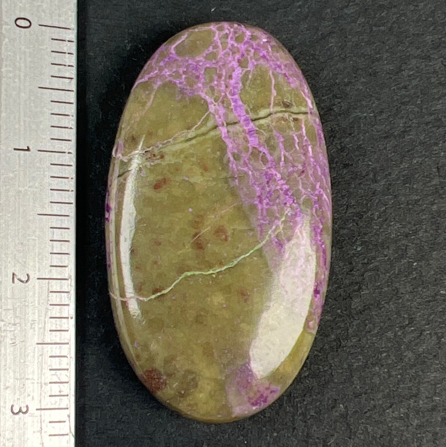 鮮やかな赤、もしくは紫と、サーペンティンの緑が混ざり合う希少な鉱物です。