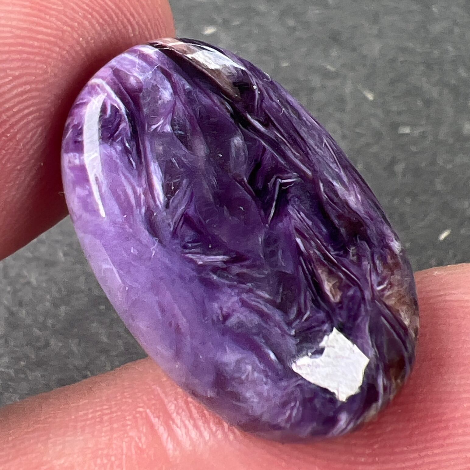 その中でもマーブル、紫色の深みともに美しいチャロアイトです。