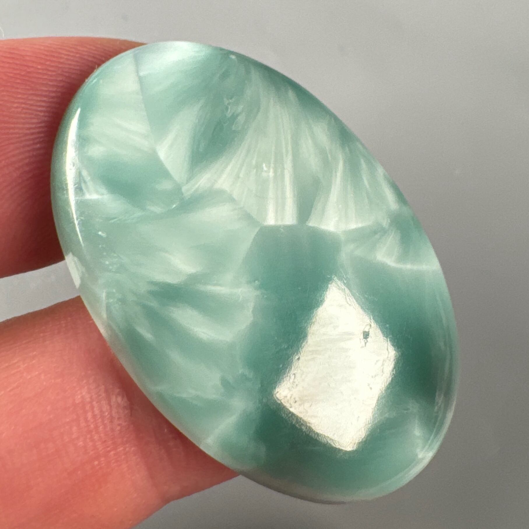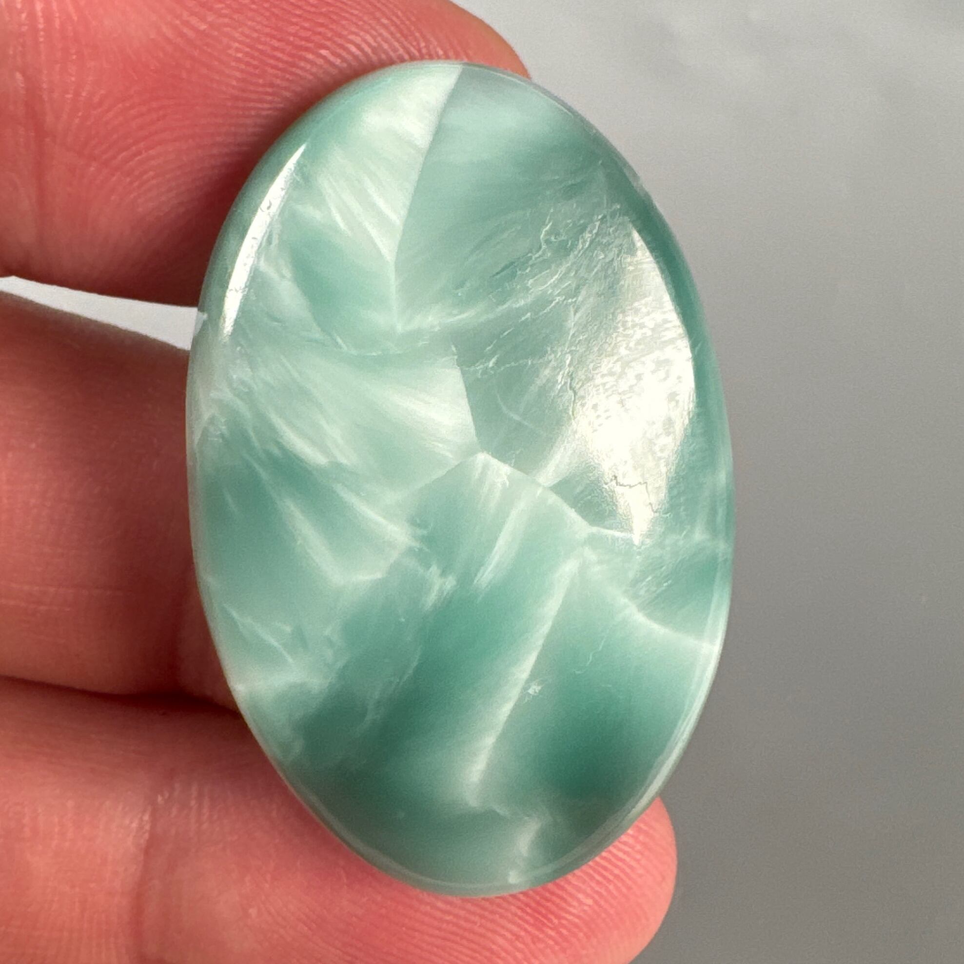 現在では、この爽やかな色を持った石が、一般的にヘミモルファイトの名で流通しています。