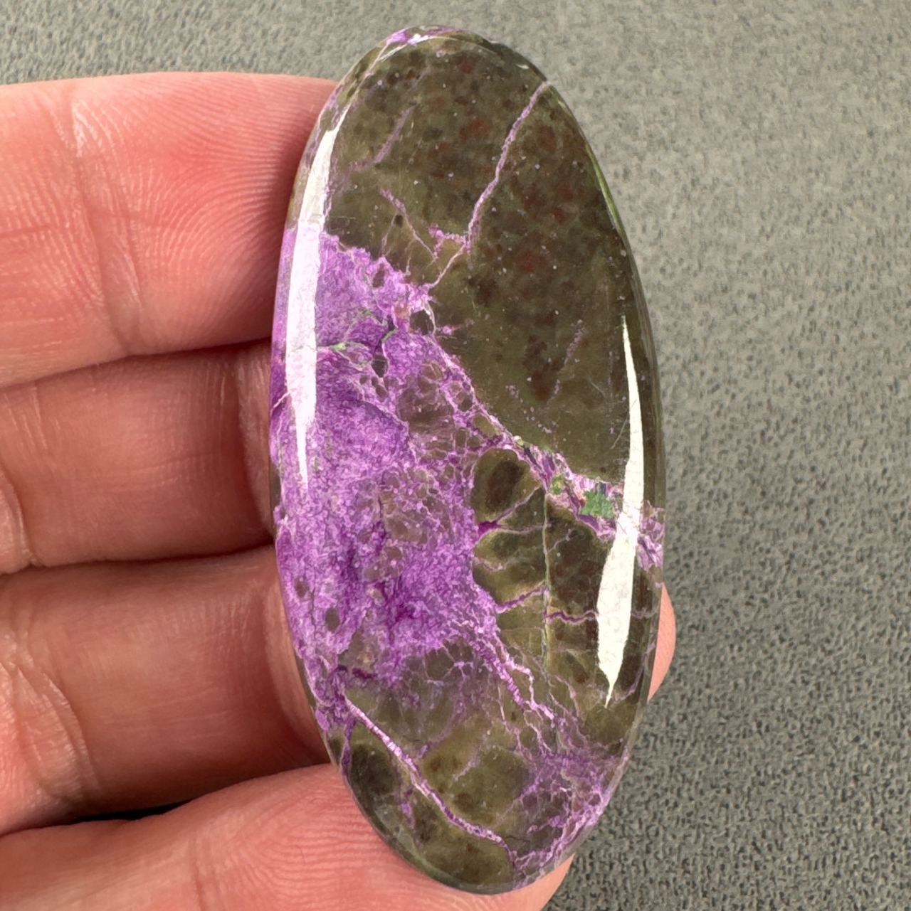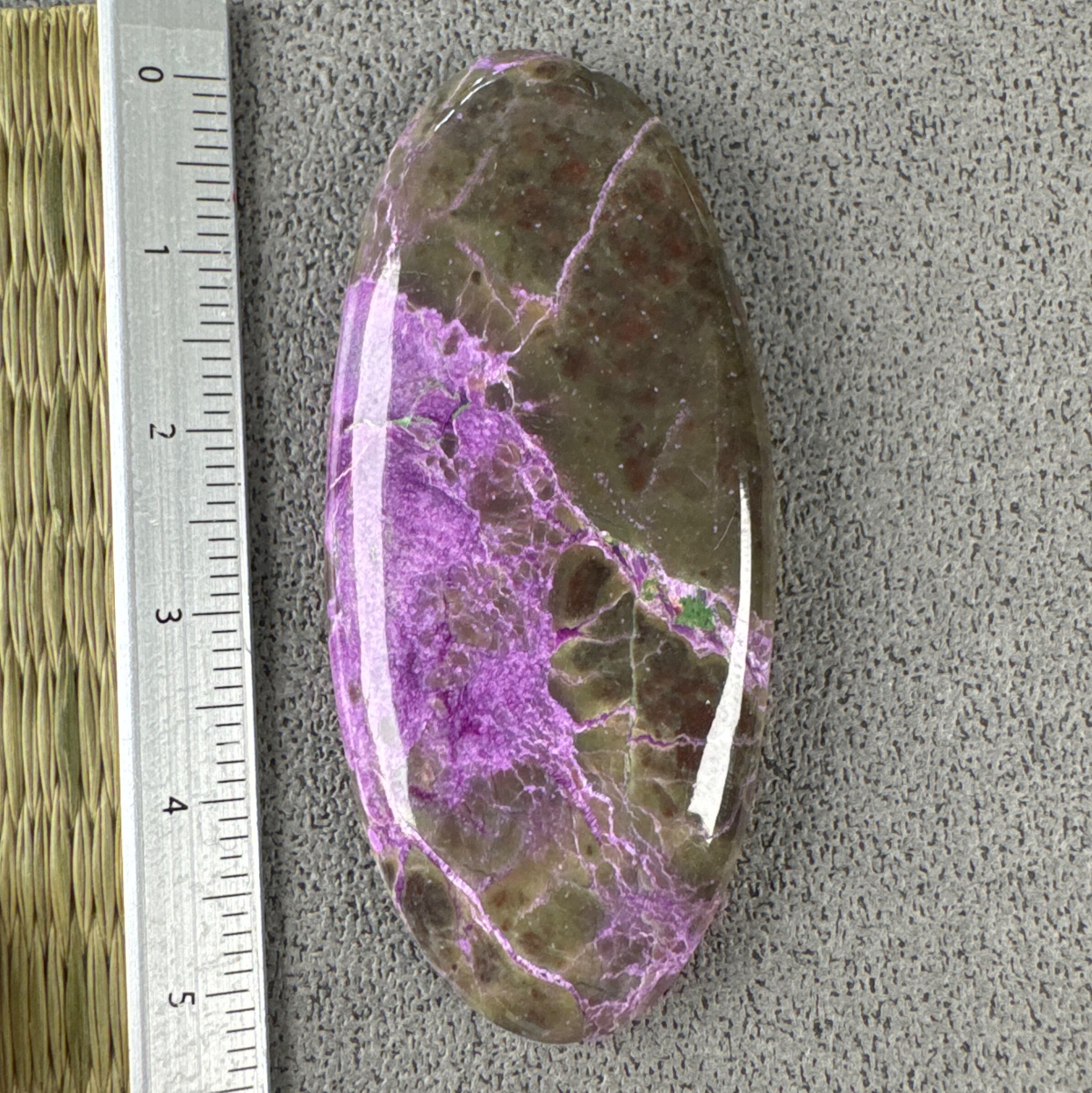 鮮やかな赤、もしくは紫と、サーペンティンの緑が混ざり合う希少な鉱物です。