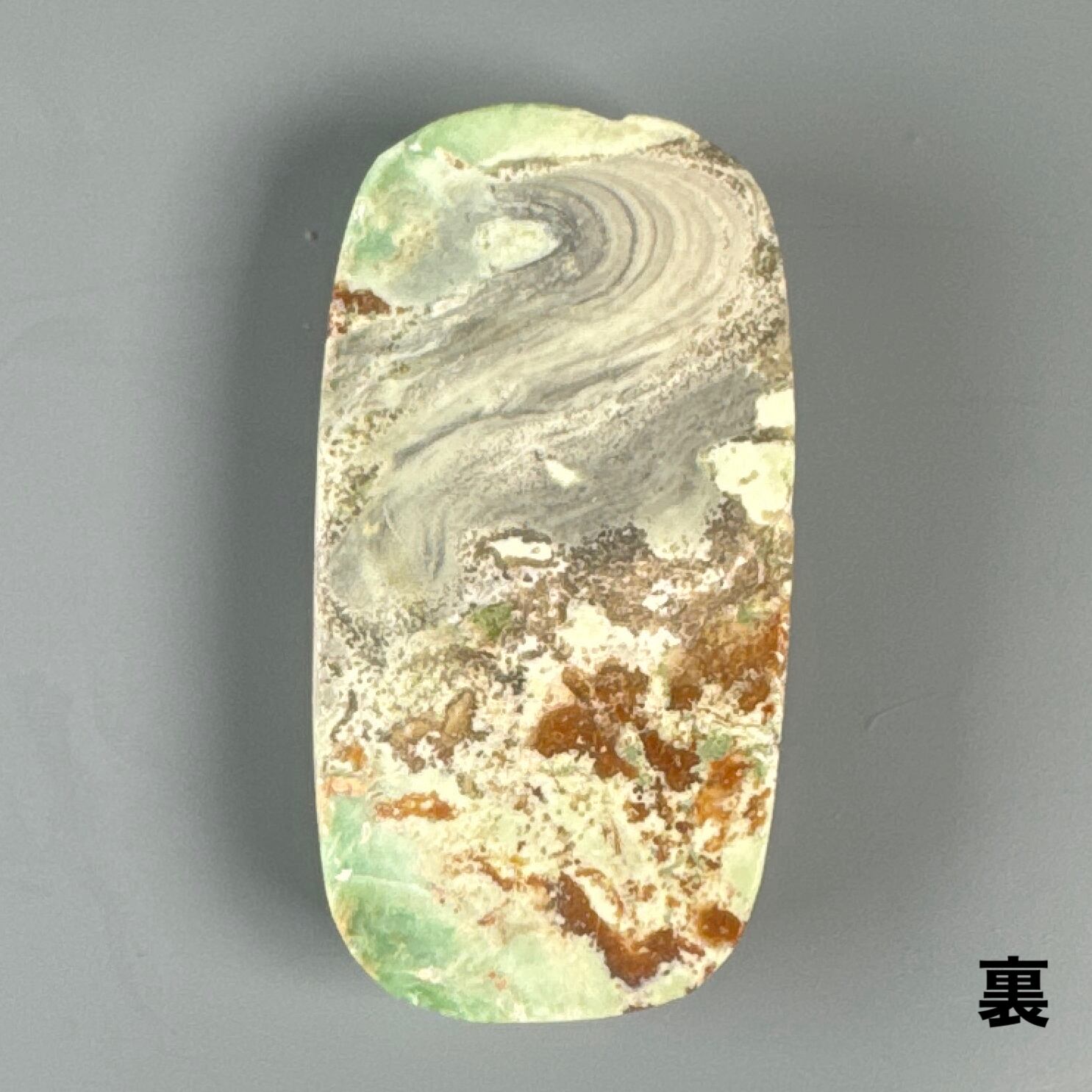 草色と茶色の滑らかな内包物が見られ、天然石といった風合いです。