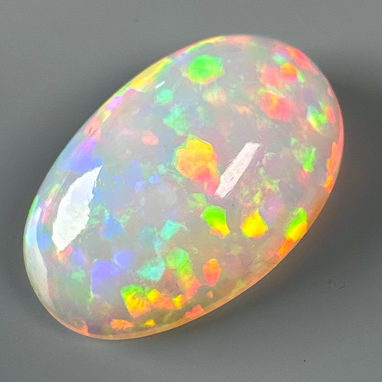 このオパールは、5Aクラスという最高品質のホワイトオパールです。その美しさは一見の価値あり。ハッとするような光彩が特徴で、室内光でも十分にその輝きを楽しむことができます。太陽光の下では、蛍光色のキラキラとした遊色が広がり、まるで光のマジックを見ているかのようです。