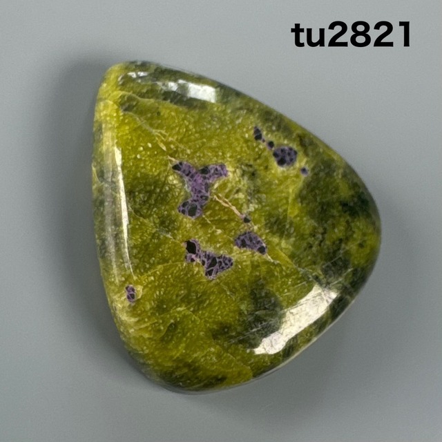 アトランティサイトのルース。 模様はまるでドラクエの荒野に紫の毒の沼があるように見える模様の天然石です。 集合鉱物にありがちな表面のガサ付きもなく、 ツヤツヤ光沢の高品質です。 鉱物的には、 スティクタイトインサーペンティン。 サーペンティンをベースに、 毒の沼に見える紫のスティクタイト。 産出されたのがタスマニアで、 9000年前に現存したアトランティス大陸と、 現在存在しながら、 生物学的にもガラパゴス化した特異な経緯のタスマニアに因んで名付けられた天然石。 サイズ:約26.5ミリ×19ミリ×6ミリ 重さ:約5.3グラム。 あなたにはこのルースから どんなアクセサリーを創造しますか? 自然の面白さ、 宇宙の神秘をいつも身に着けてみませんか? 天然石の為、表面に僅かなカケ、ヒビが見られることがあります。 天然石の特性としてご容赦くださいますよう よろしくお願い致します。