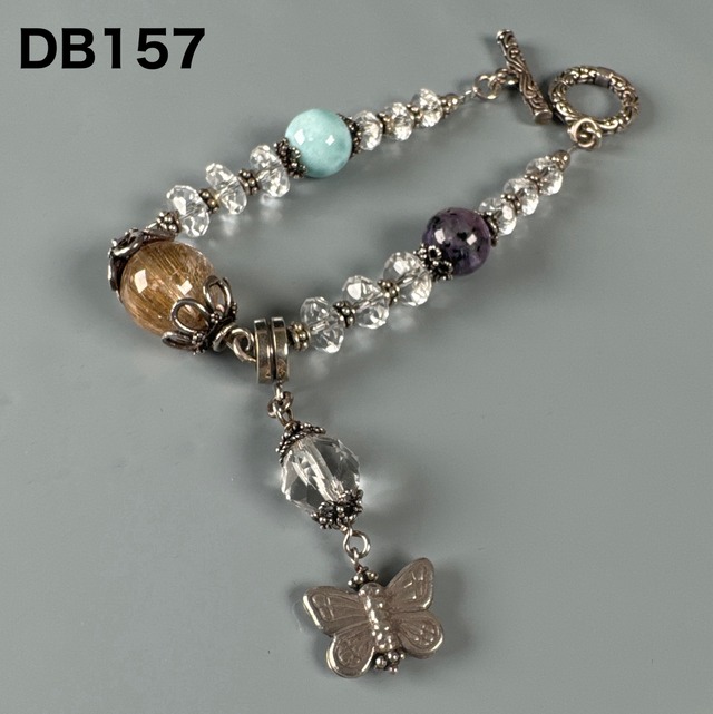 高品質のルチルクォーツ、高品質ラリマー、チャロアイト、シルバー925パーツを ワイヤーで繋いだブレスレットです。 カレンシルバーのバタフライチャーム付き。 留め具はマンテルです。 素材:高品質ルチルクォーツ、高品質ラリマー、チャロアイト、カット水晶、 シルバー925装飾ビーズ。 手首内径サイズ:約15.5センチ。
